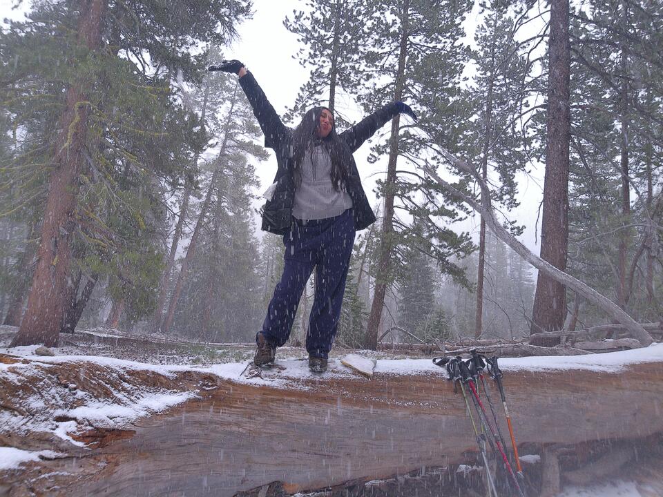The group hiked out to McGurk Meadow on Tuesday, it was also the day forecasted to be the coldest and with the possibility of snow. The morning was clear as the group woke up in Yosemite Valley, but as the day went on clouds began to form overhead and the wind picked up. The group knew they were racing the storm as they made their way to where they would camp. As they made their way along the trail, clouds grew and enveloped them in gray but they stayed motivated and were able to get to camp with enough time to set up camp and sheltering tarps to stay out of the snow. There were mixed feelings among the group about the weather, unsure of how long the cold would stay, but everyone agreed that it was beautiful. That evening the storm broke and the group was able to cook dinner and go to bed without any precipitation and partly cloudy skies gave them windows into the starry night.