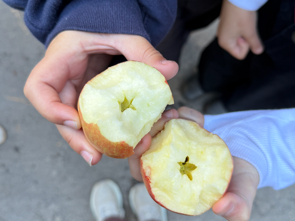 Some carry their apple untouched all day, rolling around at the bottom of their backpack. Some negotiate. “But aren’t the seeds poisonous?” “The stem is fibery, do I have to eat that part?” No matter how they wrestle with it, there’s always a moment when they approach their educator—chin lifted slightly, fist extended, knuckles out. “I did it.”