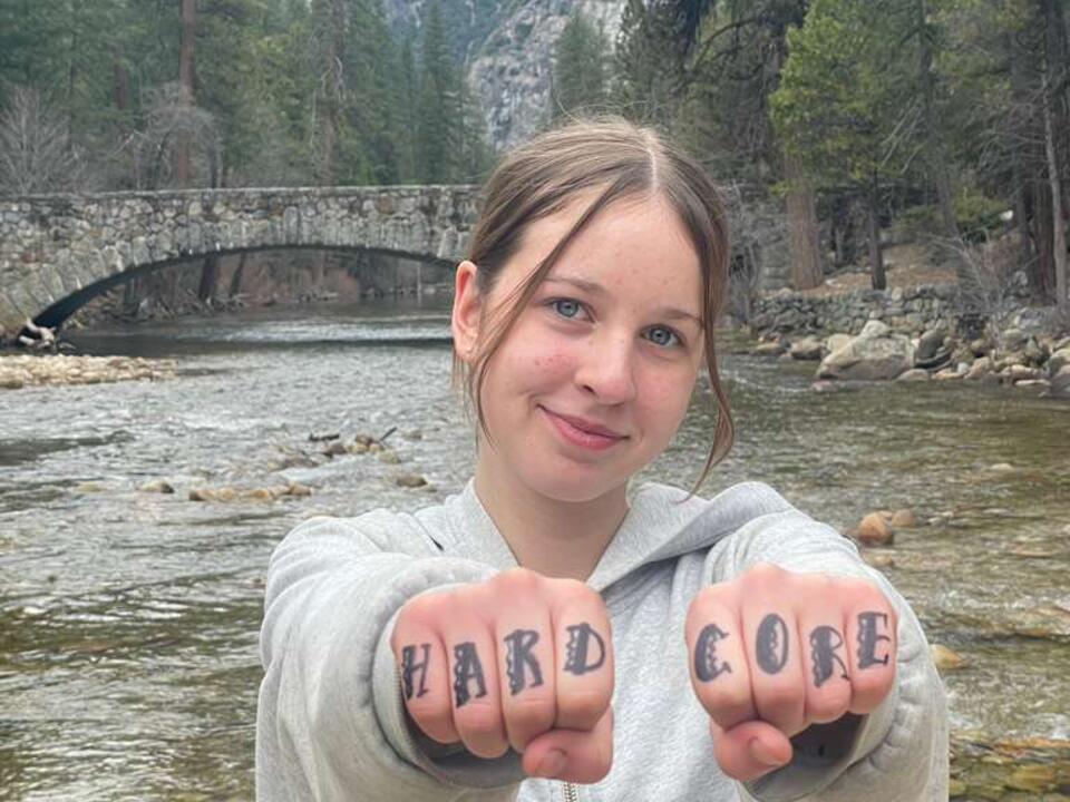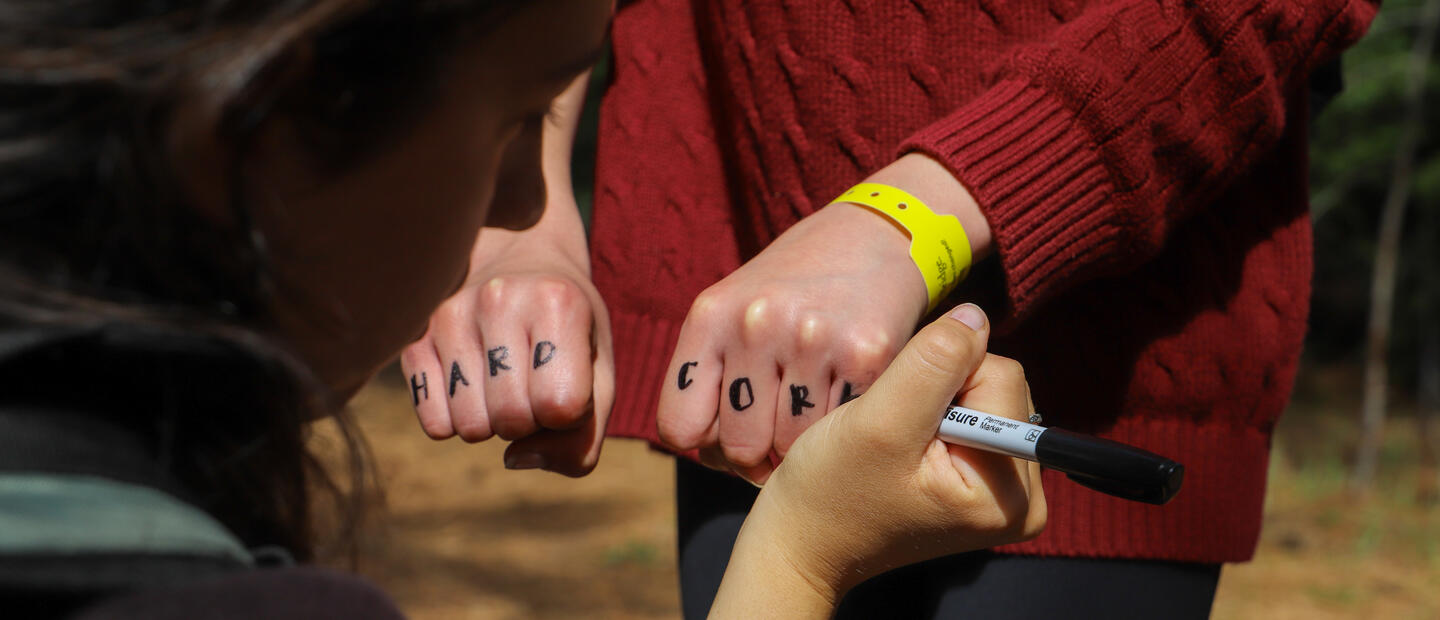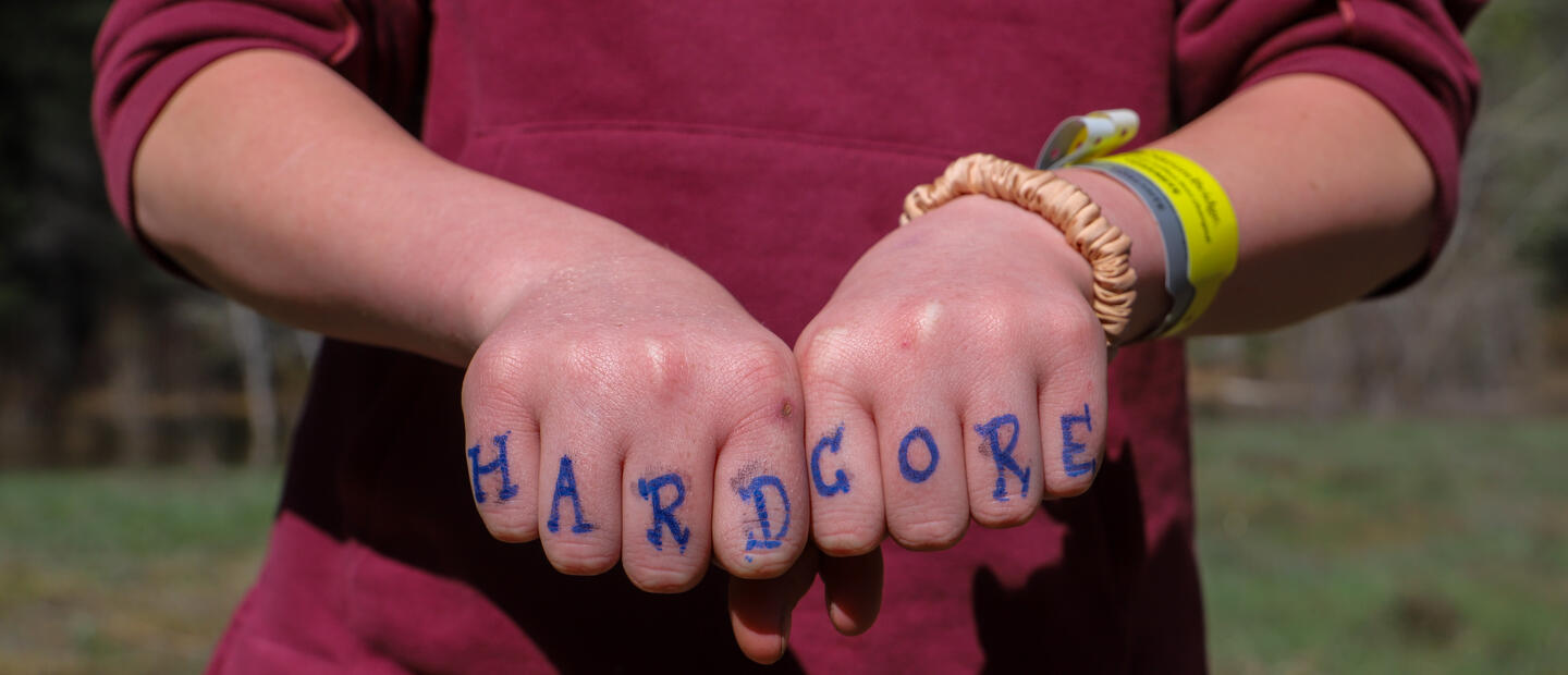 Each time a student finishes their apple they get crowned, their educators pull out their Expo markers or sharpies. Block letters across small knuckles spelling out HARD CORE. A tradition that has been carried down season after season. Every educator has a distinct font—some careful and square, others looping or bold. The handwriting becomes part of the legacy. Students hold their fists up to one another in the golden valley light like they’ve joined something ancient and secret. For a moment, they aren’t just students on a school trip. They’re part of a culture.